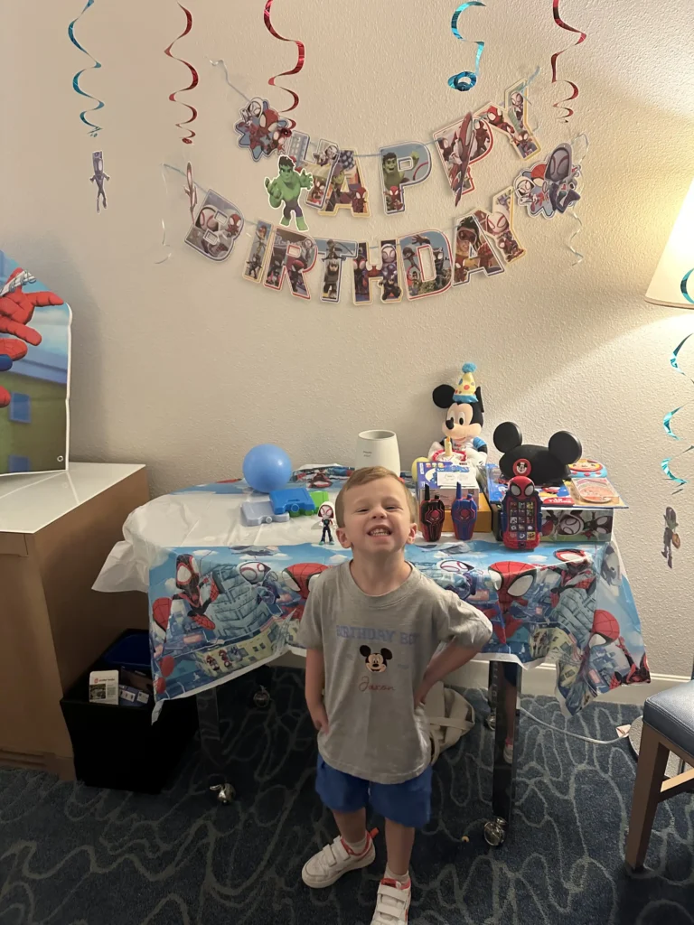 After everyone fell asleep, I stayed up decorating the room with Mickey decorations, a Spiderman theme, and gifts ready for the morning.